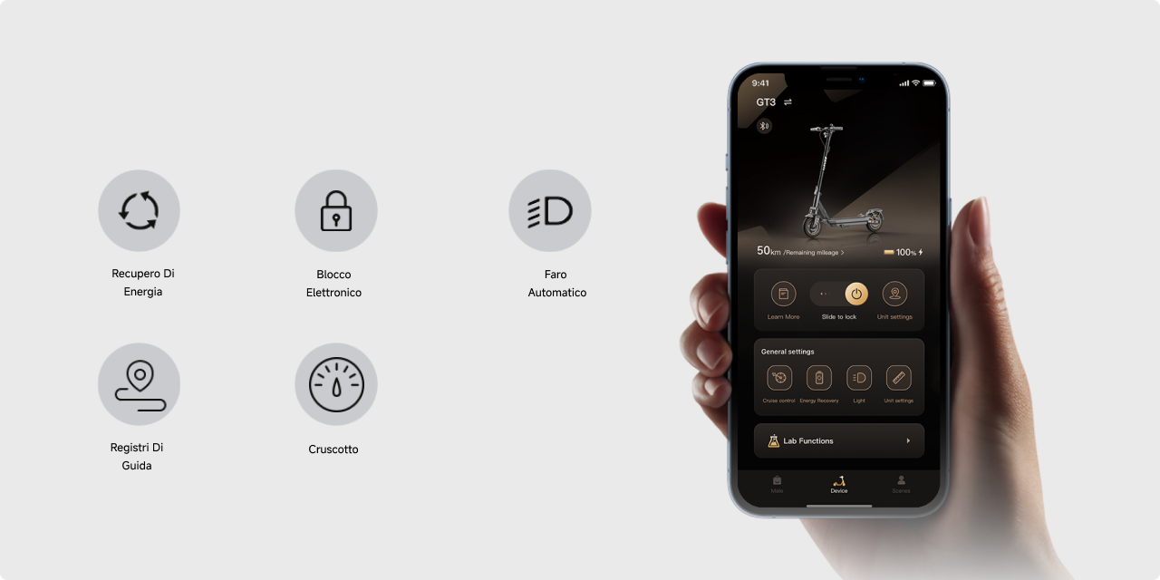Linee futuristiche e luci personalizzabili creano un'icona di stile. Che sia giorno o notte, il design accattivante trasforma ogni spostamento in un'esperienza unica e piacevole.
